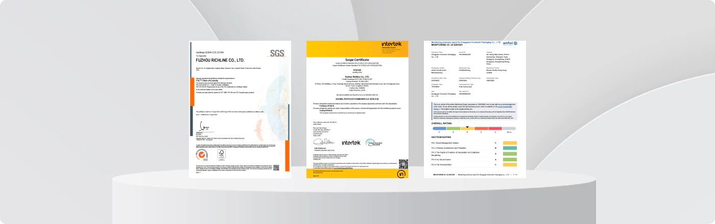 Having various certifications not only reinforces our credibility but also assures our clients that they are partnering with a responsible and sustainable packaging provider. Each certification demonstrates our commitment to quality, sustainability, and ethical practices, ensuring that our products meet the expectations of discerning customers.